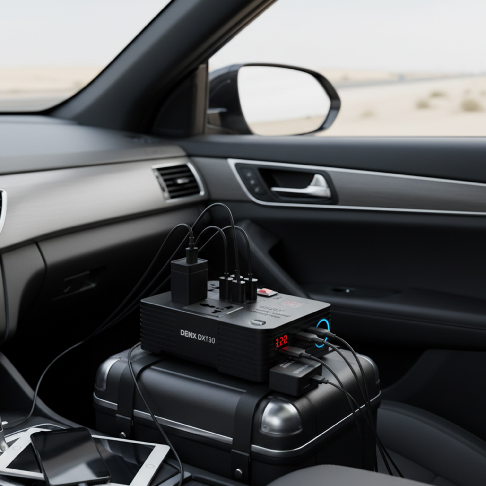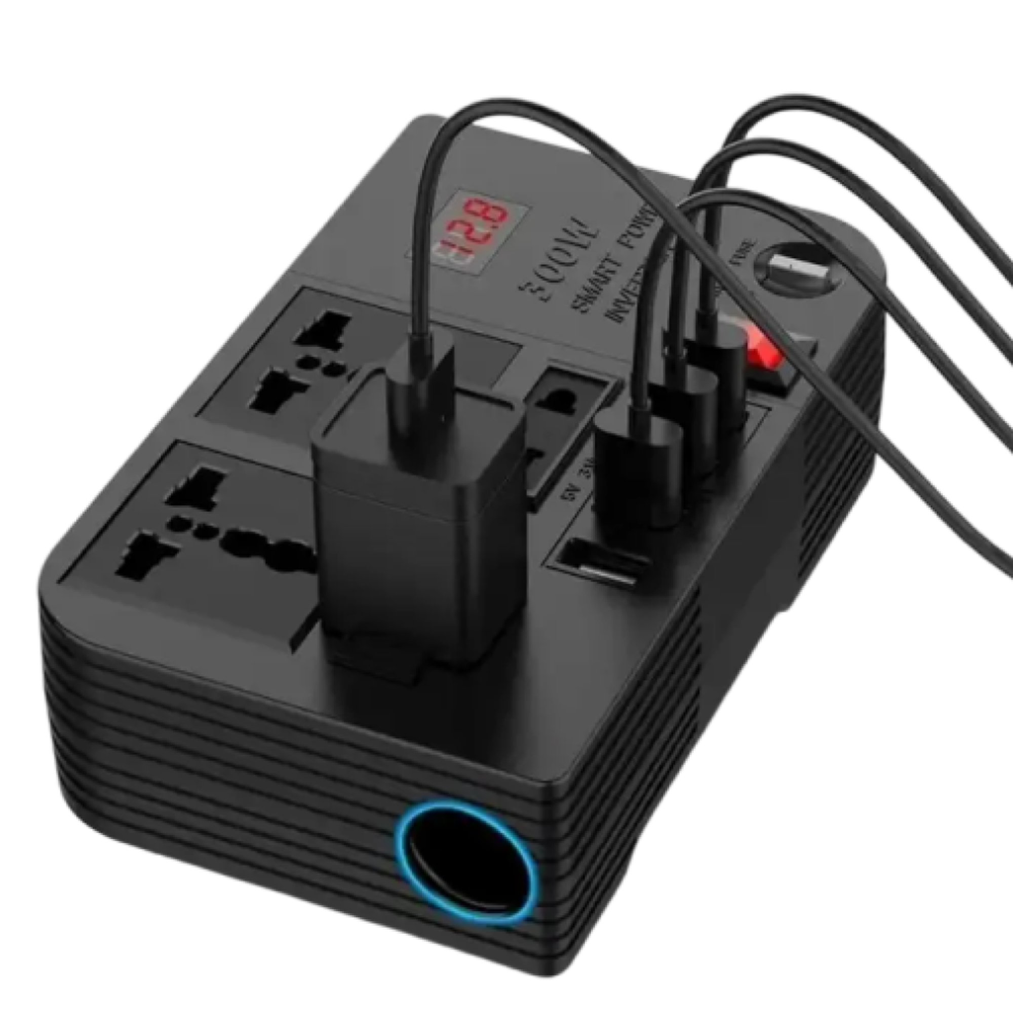 توصله بولاعة السيارة، تشغل المحول من زر التشغيل، ثم تشبك أجهزتك عبر المخارج الكهربائية أو منافذ USB وتتابع الاستهلاك من الشاشة الرقمية.